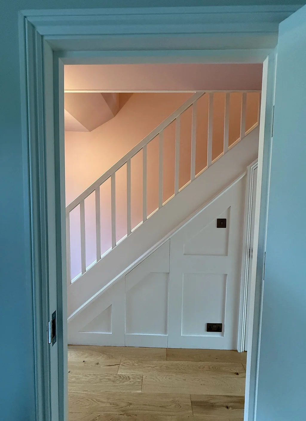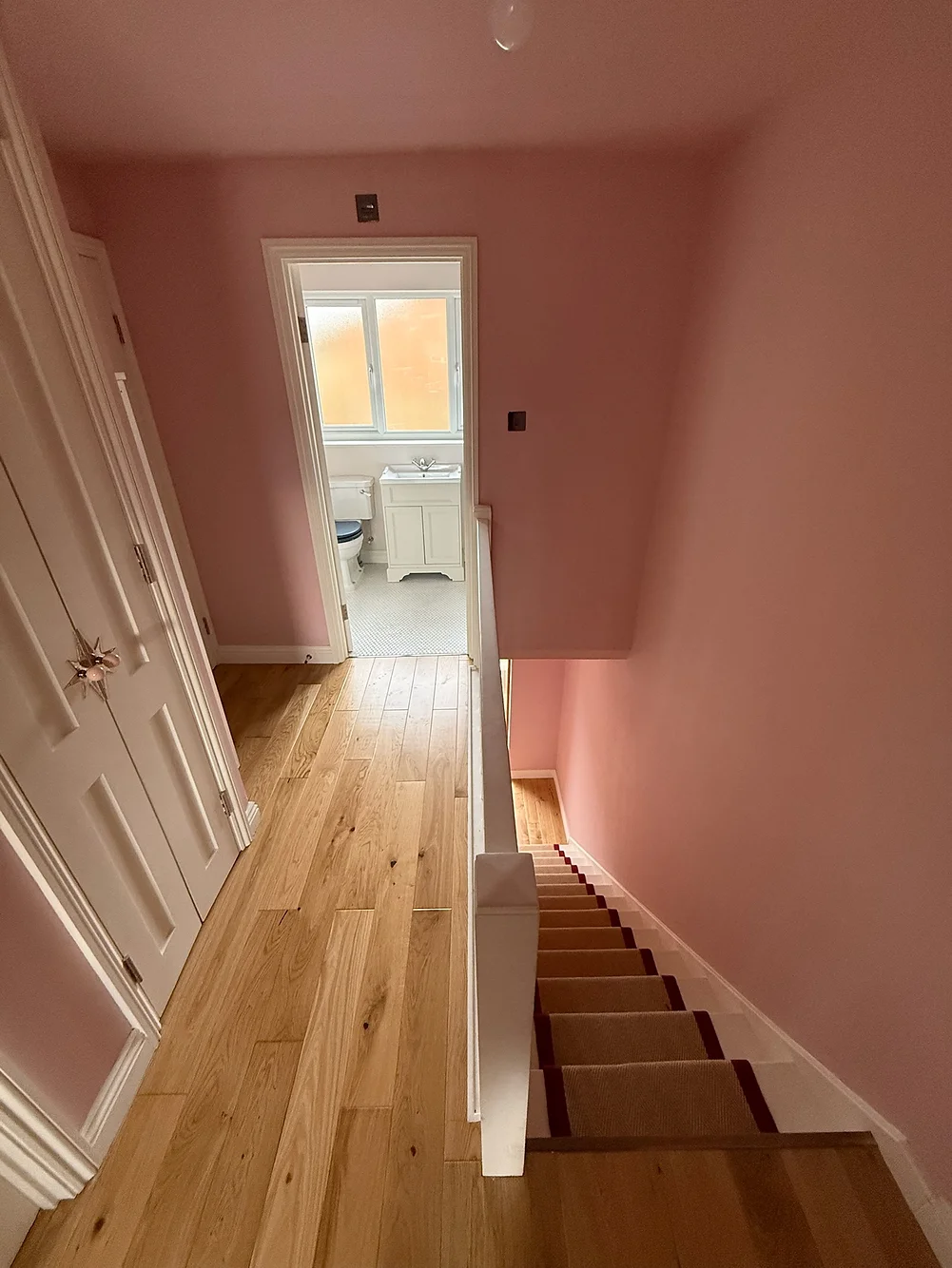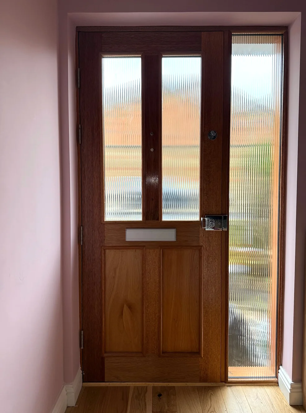 For our beloved Dicken's Street we did a complete renovation. This included remaking under-stairs storage into a cloakroom, removal of chimney breasts on the first and second floors, and opening the living room into a larger more inviting space. All windows and French doors were replaced with UPVC, while the main front door was crafted by Asher Design & Build Ltd. Using hardwood Meranti, featuring double glazed ribbed glass panels that elegantly match the hallway entrance door.